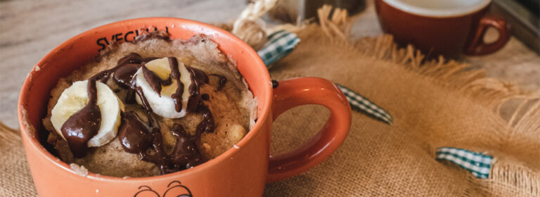 PREPARAZIONE: Inizia sciogliendo il burro nel microonde all’interno della tazza che andrai a utilizzare. Aggiungi quindi la banana tagliata a pezzetti e schiacciala con una
