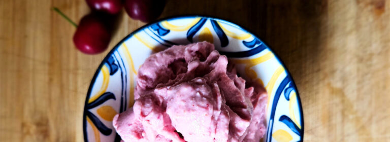 PREPARAZIONE: Tagliate le ciliegie a pezzetti e congelatele per qualche ora. Mettete nel frullatore lo yogurt greco e le ciliegie congelate. Frullate fino ad ottenere